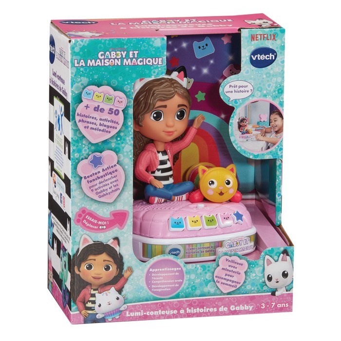 Gabby et la maison magique - Lumi-conteuse à histoires de Gabby - 3 - 7 ans Une conteuse senchationnelle pour faire le plein de découvertes ! Très complète, cette jolie conteuse à histoires aux couleurs de la série possède : - 4 boutons Histoires Fanchastiques : Gabby et Polochat racontent de grandes histoires avec des effets sonores et lumineux. - 1 bouton Action pour s'amuser avec Bébé Boîte, Dj Miaou, Gabby et tous leurs amis à travers 9 activités ludiques. - Une veilleuse avec fonction minuterie pour accompagner le sommeil. Arrêt automatique et réglage du volume sonore. Boîte ouverte. Fonctionne avec 3 piles LR6 fournies.