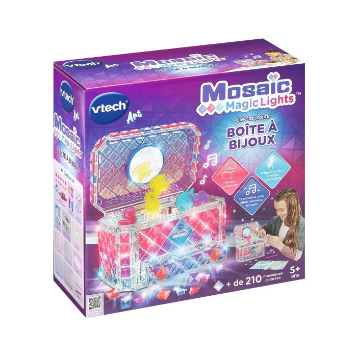 Mosaic Magic Lights – Boîte à bijoux - 5 ans + Une boîte à bijoux lumineuse et musicale à créer en mosaïque ! Magique, la boîte à bijoux s’illumine de différentes couleurs avec des mélodies entraînantes ou relaxantes. 4 personnages inclus à insérer dans la boîte à bijoux pour déclencher des ambiances sonores et musicales différentes. Personnalisable à l’infini : Plus de 200 pièces incluses. Une spatule permet de retirer facilement les pièces. Compartiments et tiroir de rangement pour ses bijoux. Arrêt automatique. Boite fermée. Fonctionne avec 4 piles LR6 fournies.