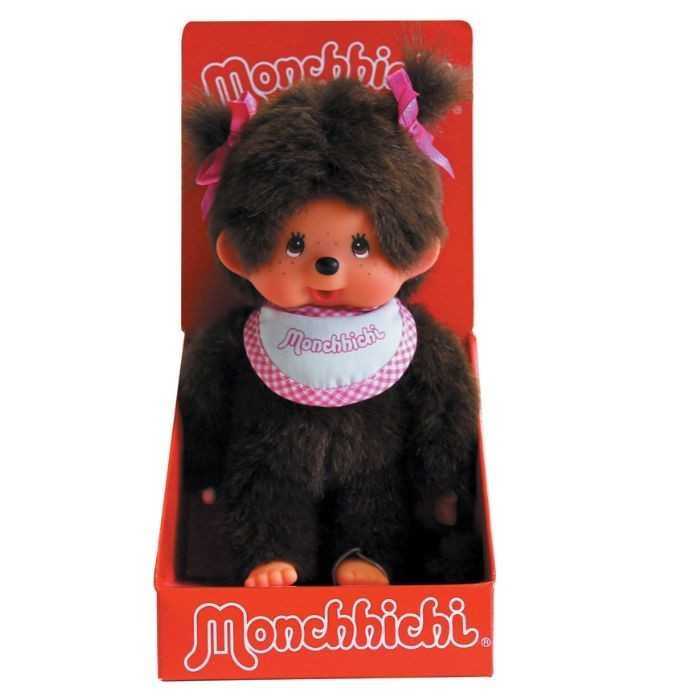 Découvre la peluche Monchhichi, le célèbre singe avec sa tétine dans une version classique fille de 20 cm avec un bavoir blanc et rose.