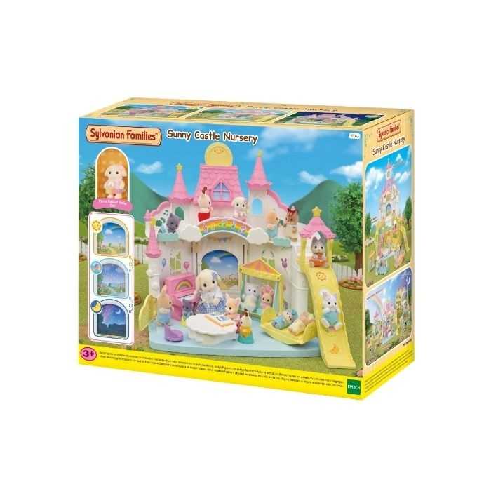 La crèche ensoleillée est un endroit très amusant pour les bébés grâce à ses nombreux équipements et fonctionnalités : un piano, un grand toboggan, un tableau qui se transforme en balançoire et une table qui se transforme en un petit toboggan En actionnant les deux leviers, il est possible de changer le décor (ensoleillé, pluvieux ou de nuit) et de faire apparaître le soleil et le nuage La crèche ensoleillée contient le bébé Lapin Bélier