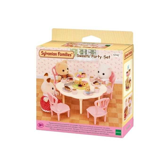 Ce set contient tout le nécessaire pour organiser un délicieux goûter : quatre chaises, une table, de la vaisselle, un présentoir à gâteaux, des pâtisseries et des bonbons