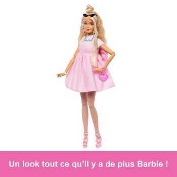 Des plumetis et un grand nœud rose ajoutent une touche d’originalité à la robe rose tendre de Barbie. Solaires, sac et bijoux accessoirisent la poupée.