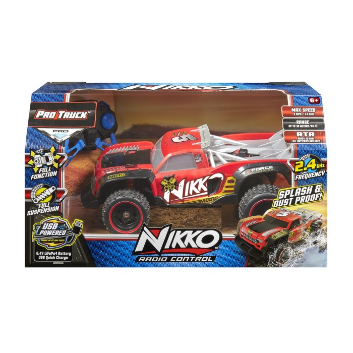 PRO TRUCKS. Un 4x4 Truck échelle 1:12. Véhicule résistant aux éclaboussures et à la poussière - Portée 40 métres - Mouvement à 360° - Vitesse de 14Kms/h - Télécommande radio de 2,4 GHz - Récharge rapide avec clé USB incluse. Nécessite 3 piles LR03 et batterie lithium 6,4 v incluses.